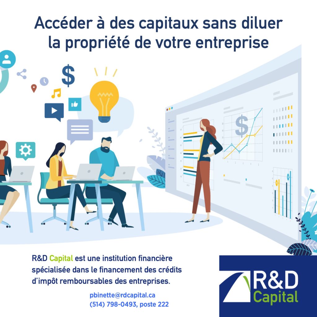 R&D Capital est l’expert canadien dans le financement des crédits d’impôt en recherche et développement (RS&DE), en crédits d’impôt affaires électronique (CDAE) et multimédia. N’hésitez pas à nous contacter. Vous aurez droit à un service courtois, simple et rapide, qui vous permettra de connaître en 10 jours ouvrables le financement auquel vous pouvez avoir accès. Pour plus d’information, vous pouvez nous joindre par courriel à pbinette@rdcapital.ca ou au numéro (514) 798-0493, poste 222. Il nous fera plaisir de vous accompagner dans la réalisation de vos projets et de vos ambitions.